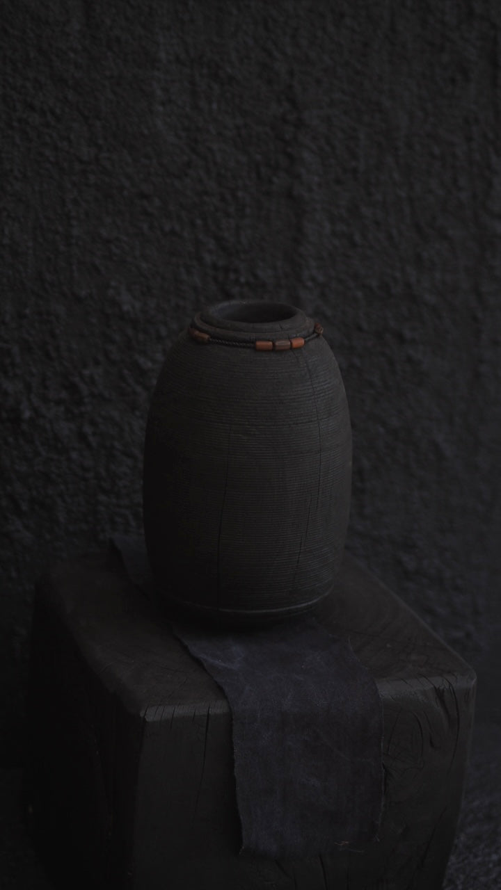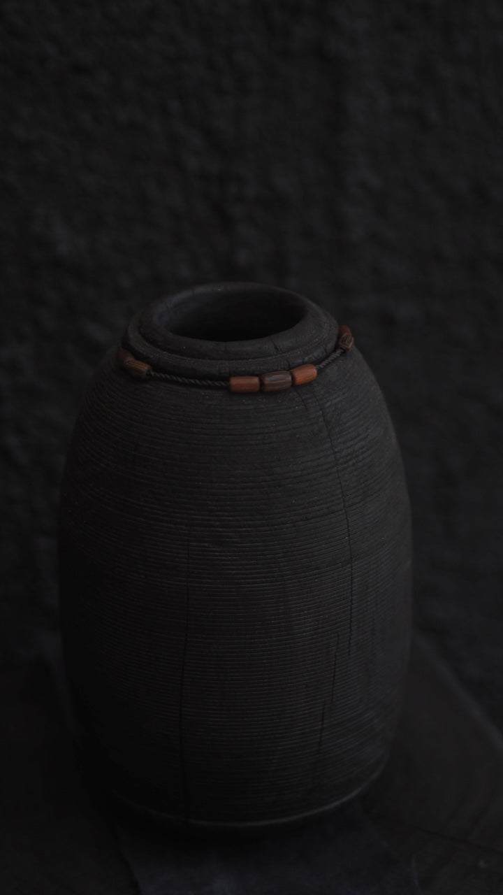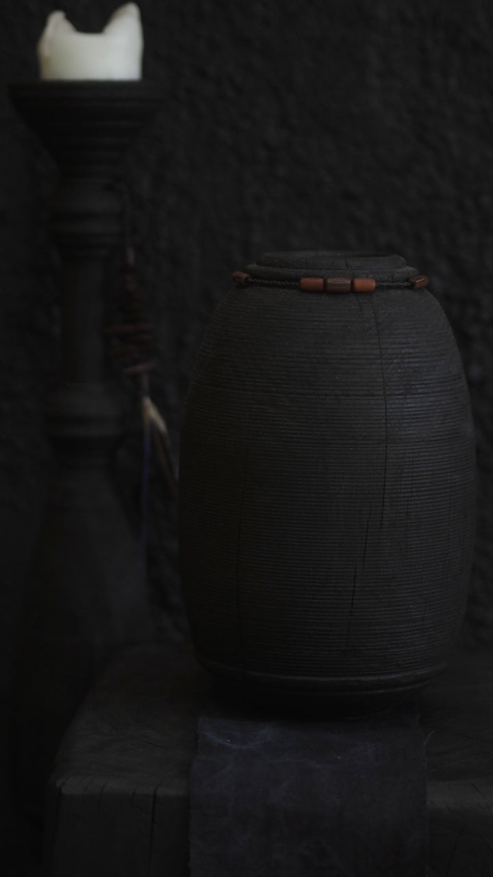 Pluto's Lament Vessel, Carved and preserved from fallen Black Wattle wood, sourced from a local property in Emerald, Victoria, The pieces holds space at 24 cm in Height and 14 cm in Diameter, Adorned in hand carved wood beadworks, this vessel is for grief, when it has nowhere to go, A container that must be carried , not resolved.