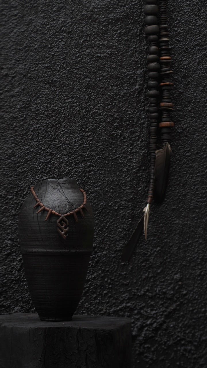 Carved and Persevered Oak wood vessel, with Wenge wood bead works. A piece from the 'inbetween worlds' collection carved as an ode to the tall trees that stand sentinel over this land.